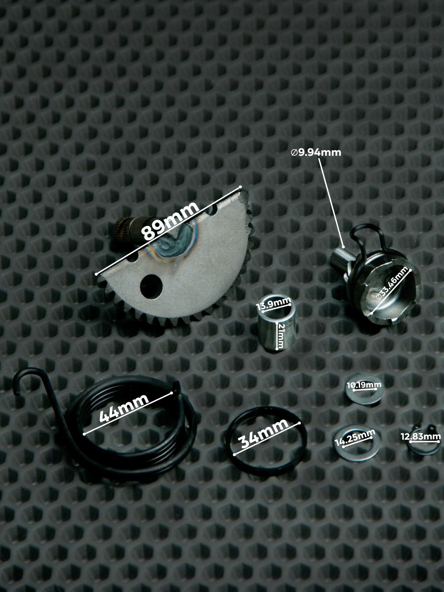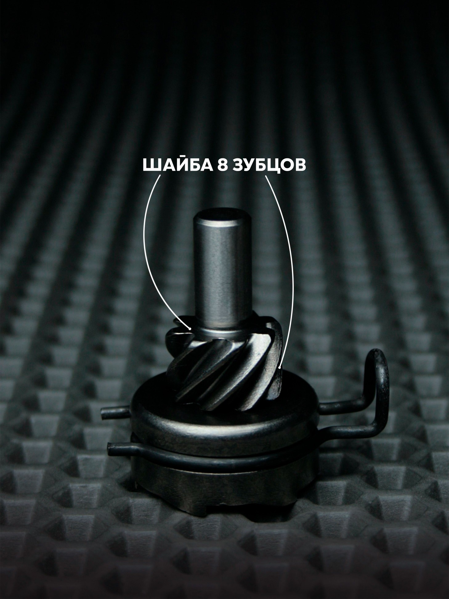 Полумесяц, храповик, пружина, демпфер полумесяца, нижняя шайба храповика, шайба стопорного кольца, стопорное кольцо.