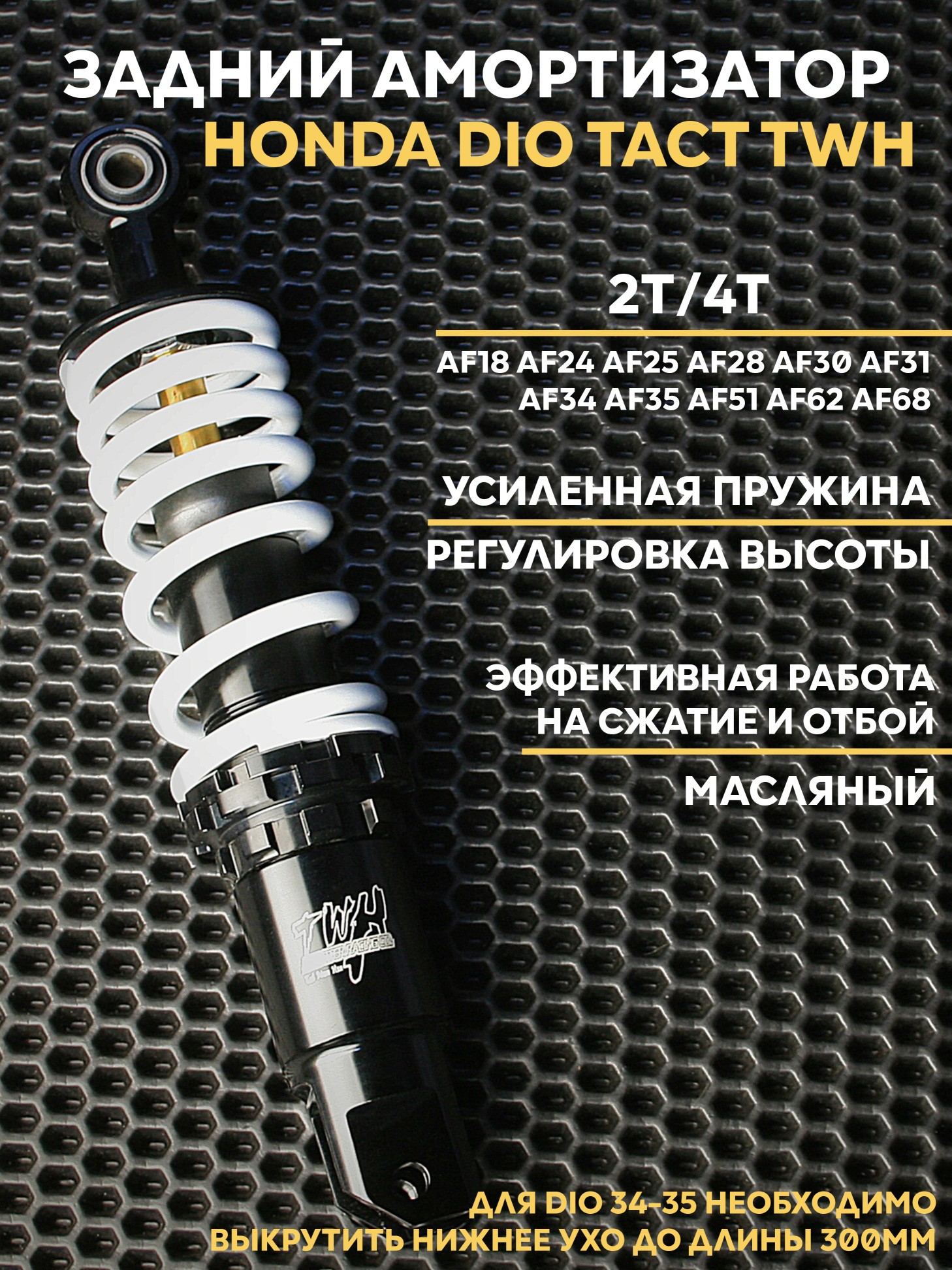 • Примечание по установке: на Dio 34-35 требуется выкрутить нижнее ухо на максимум; на Dio AF62-68 возможно смещение воздушного фильтра на 1 см из-за широкой пружины