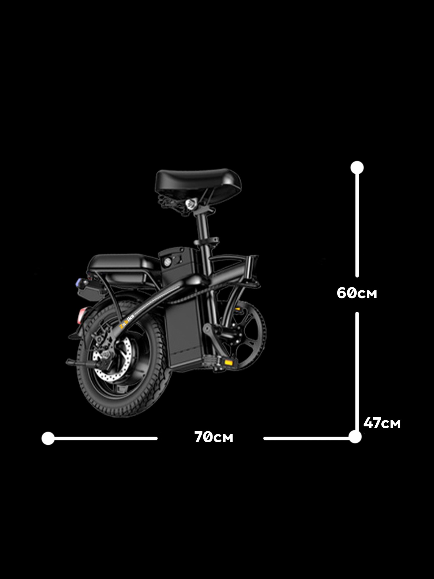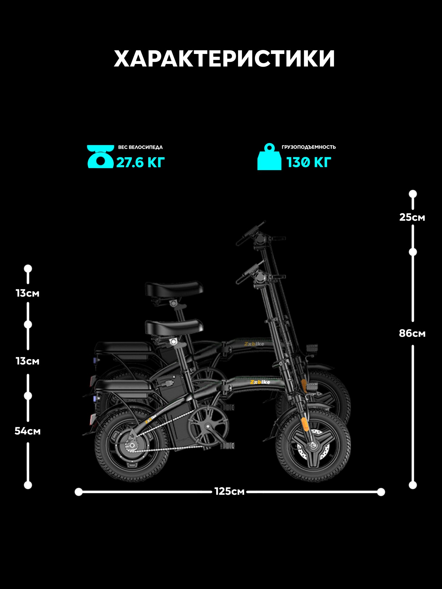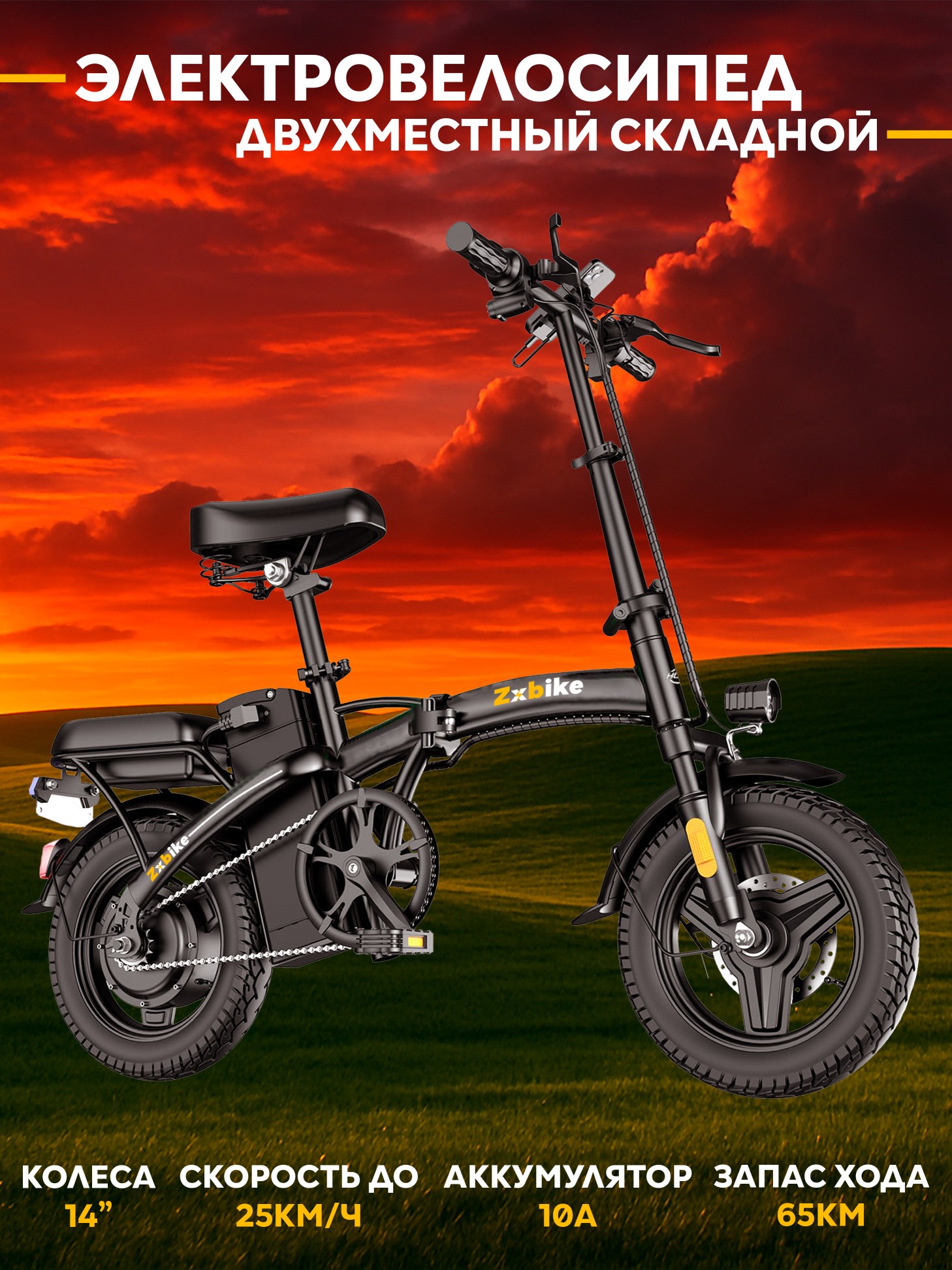 Ключевые характеристики:Бесшумный мотор с максимальной скоростью 25км/ч. Какие-либо права для управления данным аппаратом не требуются.Аккумулятор 48V 10Ач. Запас хода: до 55 км на электротяге и до 65 км в гибридном режиме. Полная зарядка занимает около 7 часов. Защищен от пыли и влаги.Прочная рама из высокоуглеродистой стали. Складывается рама, руль, седло и педали для компактного хранения и перевозки в багажнике или общественном транспорте.14-дюймовые взрывозащищенные бескамерные шины и надежные дисковые тормоза.Яркие светодиодные фары с широким углом обзора для видимости в любых условиях.Рассчитан на нагрузку до 130 кг. Общий вес — 27,4 кг. Большой спектр регулировок руля и сидения. Подходит для велосипедистов ростом от 140 до 190 см.Zxbike сочетает мощность, практичность, стиль и мобильность, являясь отличным решением для ваших поездок по городу.