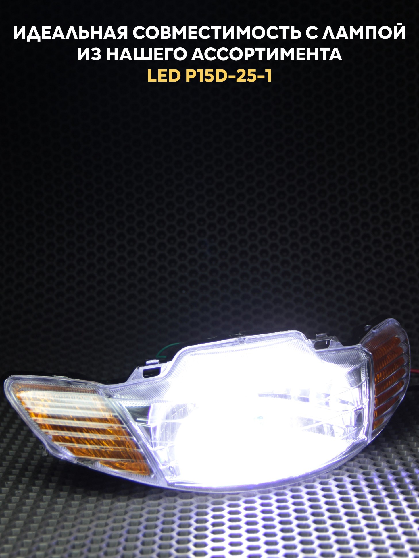 На примере работы фары используется LED лампа для Хонда Дио Такт Цоколь P15D-25-1 из нашего наличия: артикул 1390529926
