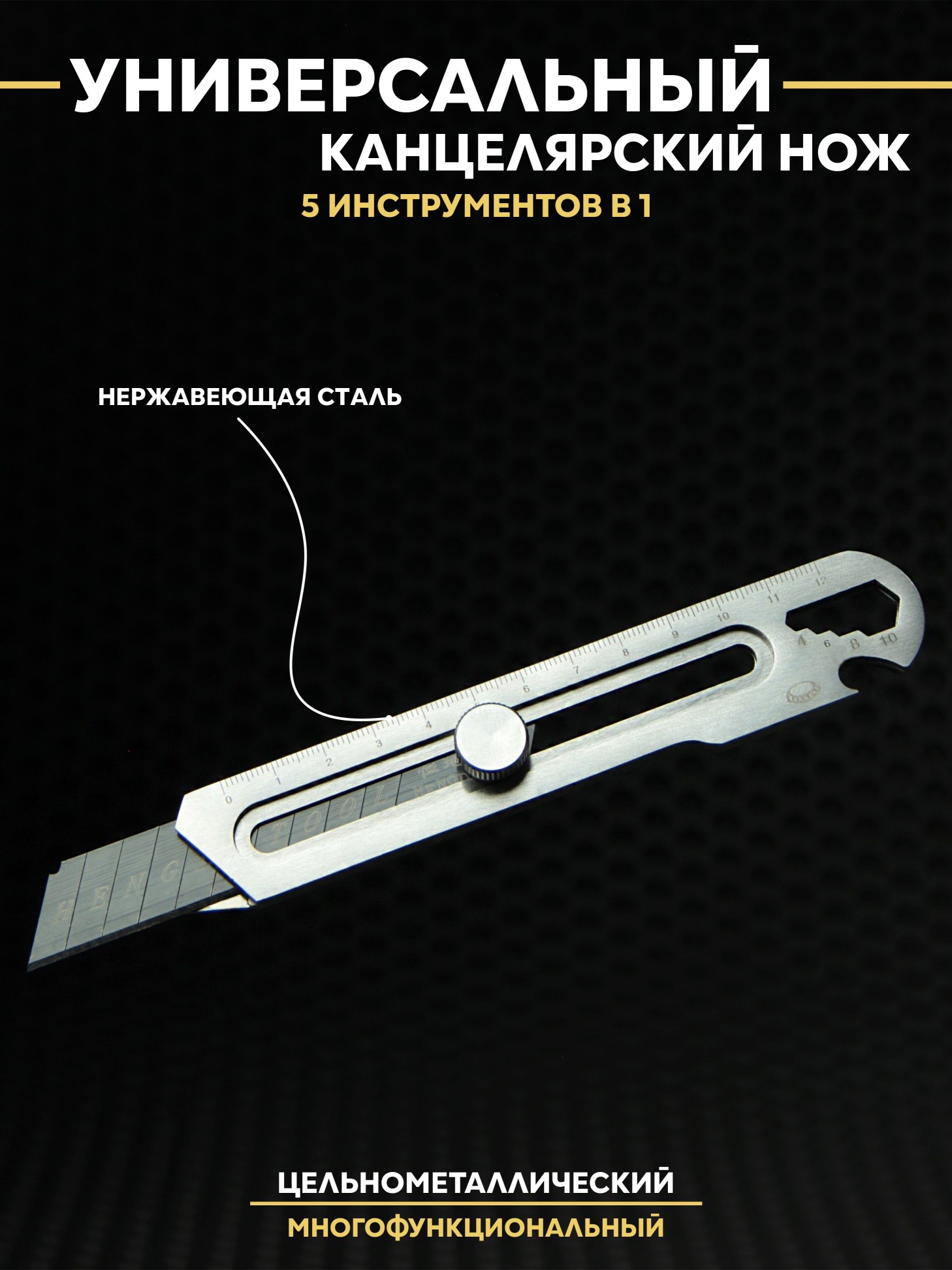 Универсальный, канцелярский, цельнометаллический нож, изготовлен из нержавеющей стали